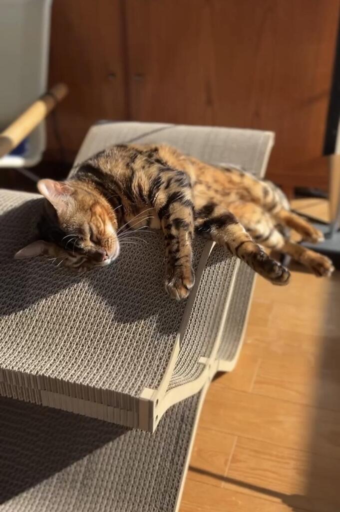 また、爪研ぎはもちろん、お昼寝、鬼ごっこしながら飛び乗ったり中をくぐって走り抜けたり。商品説明に書いてある通りで、一台で何役もこなす猫のお気に入りスポットになりました。